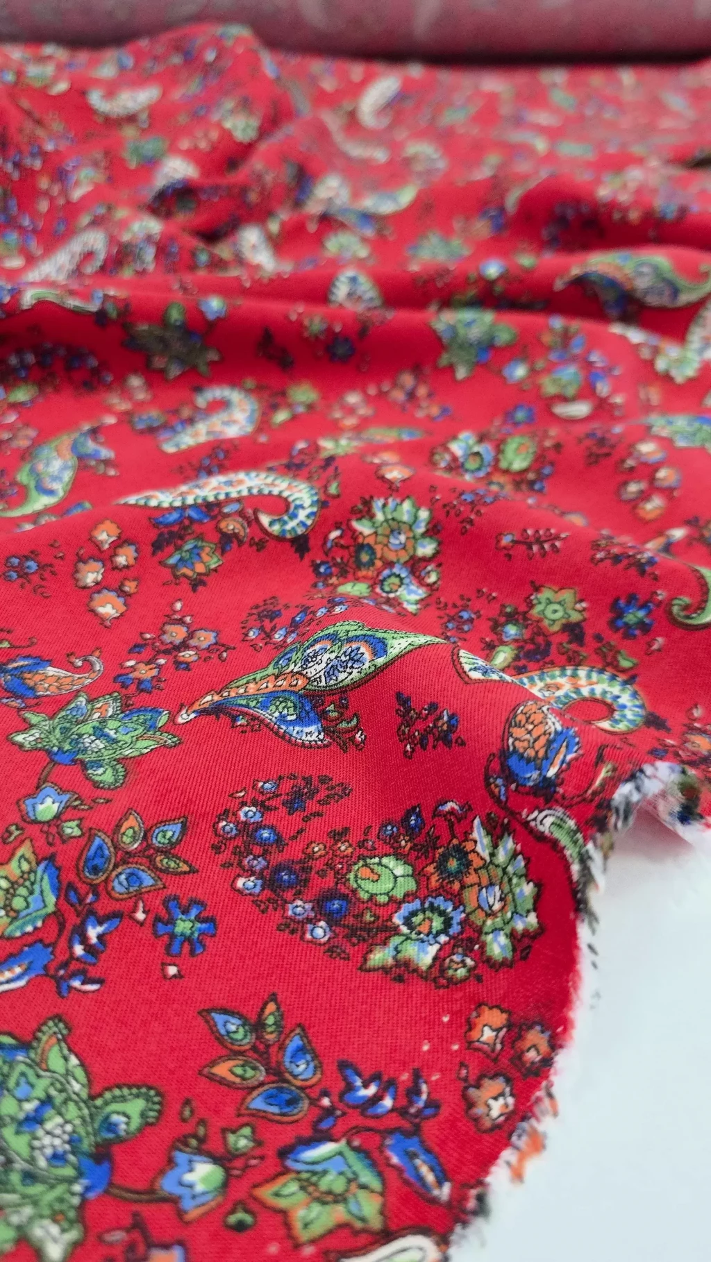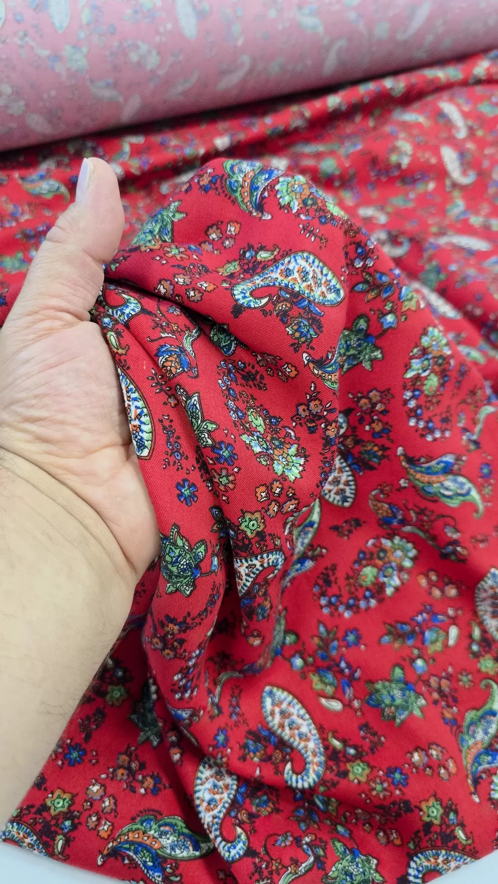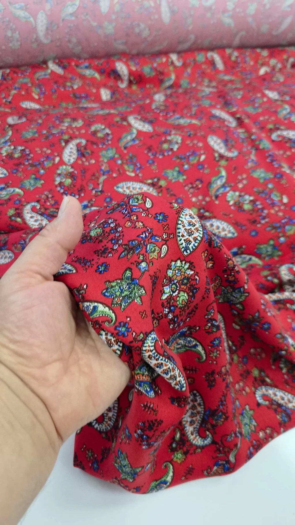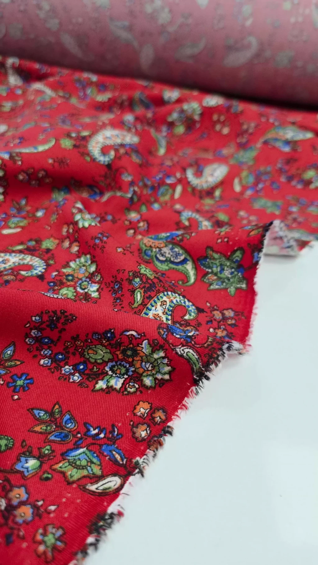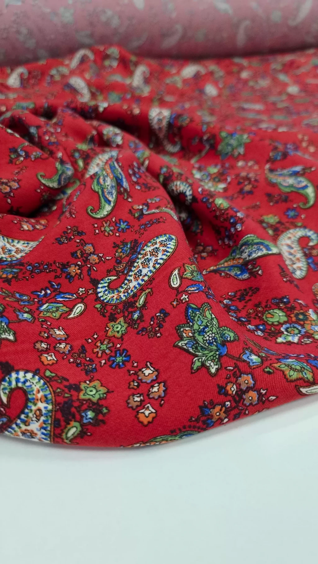 Kırmızı üzerine işlenmiş zarif şal desenleri, bu kumaşı sıradanlıktan uzaklaştırıyor. 150 cm enindeki bu %100 EcoViskon kumaş, polyester ve naylon içermeyen doğal yapısıyla hem size hem de doğaya dost. Tamamen %100 EcoViskon içerir, bu sayede terletme yapmaz, hafiftir ve cilde dosttur.